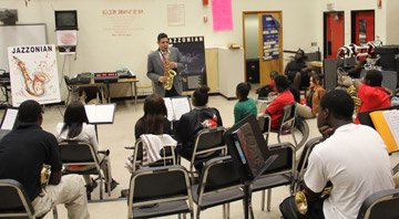 TUESDAY, OCTOBER 9th, 2012 - Founder/President of Jazzonian Bobby Ramirez spoke to Miami Edison Sr High School band about Jazz history, becoming successful as a musician, and leadership. Empowering the next generation of Jazz musicians.